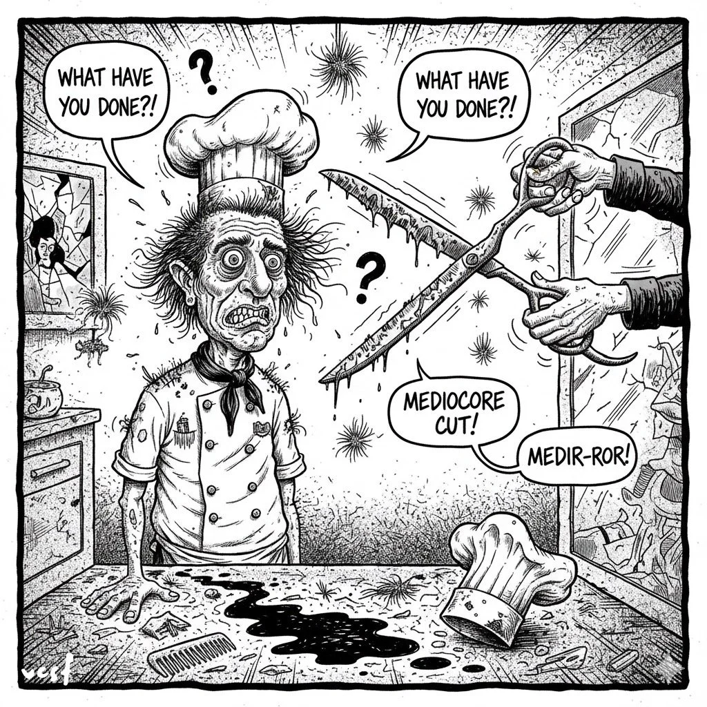 The failure is also shared. The burnt sauce, the under-cooked protein, the plate sent back—it’s the chemical burn, the haircut gone rogue, the colour that went too dark. These failures are public, immediate, and must be absorbed. The failing ideology is the same: the job demands perfection, the human provides only excellence, and the constant striving leaves its mark—on the chef’s scorched arms and the hairdresser’s aching feet and carpal tunnel.