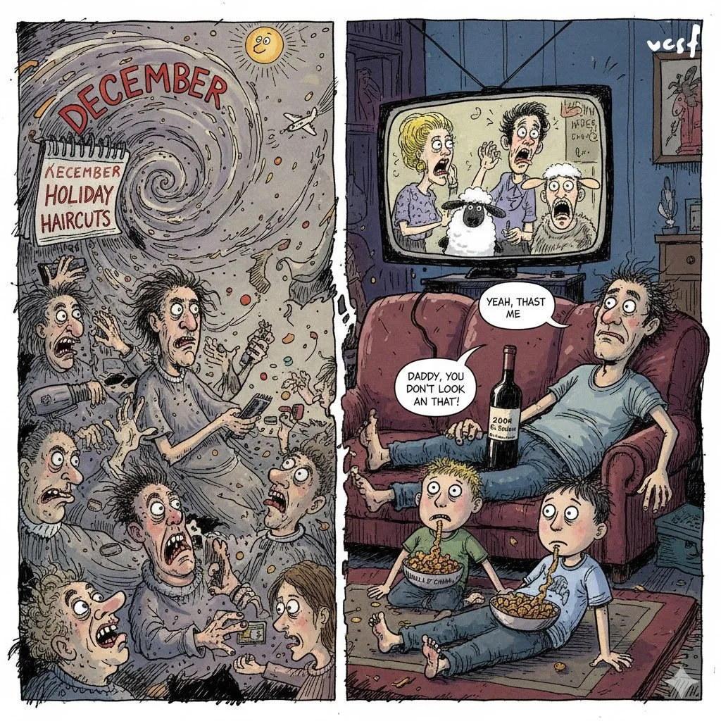 The salon is shut, its doors closed for the final time this year, and I’m home, recovering from the melee of madness that is the Christmas season in the hair industry. My legs finally feel like they are attached to my body. My back doesn’t hurt, I don’t need morning painkillers to get through the day, and most importantly, I don’t have to provide the energy-sapping, mind-consuming performance of engaging in conversation with someone new every hour for twelve hours straight. Now, I am just a dad, my working life far, far away. And if I’m honest, by December, I’ve had enough.